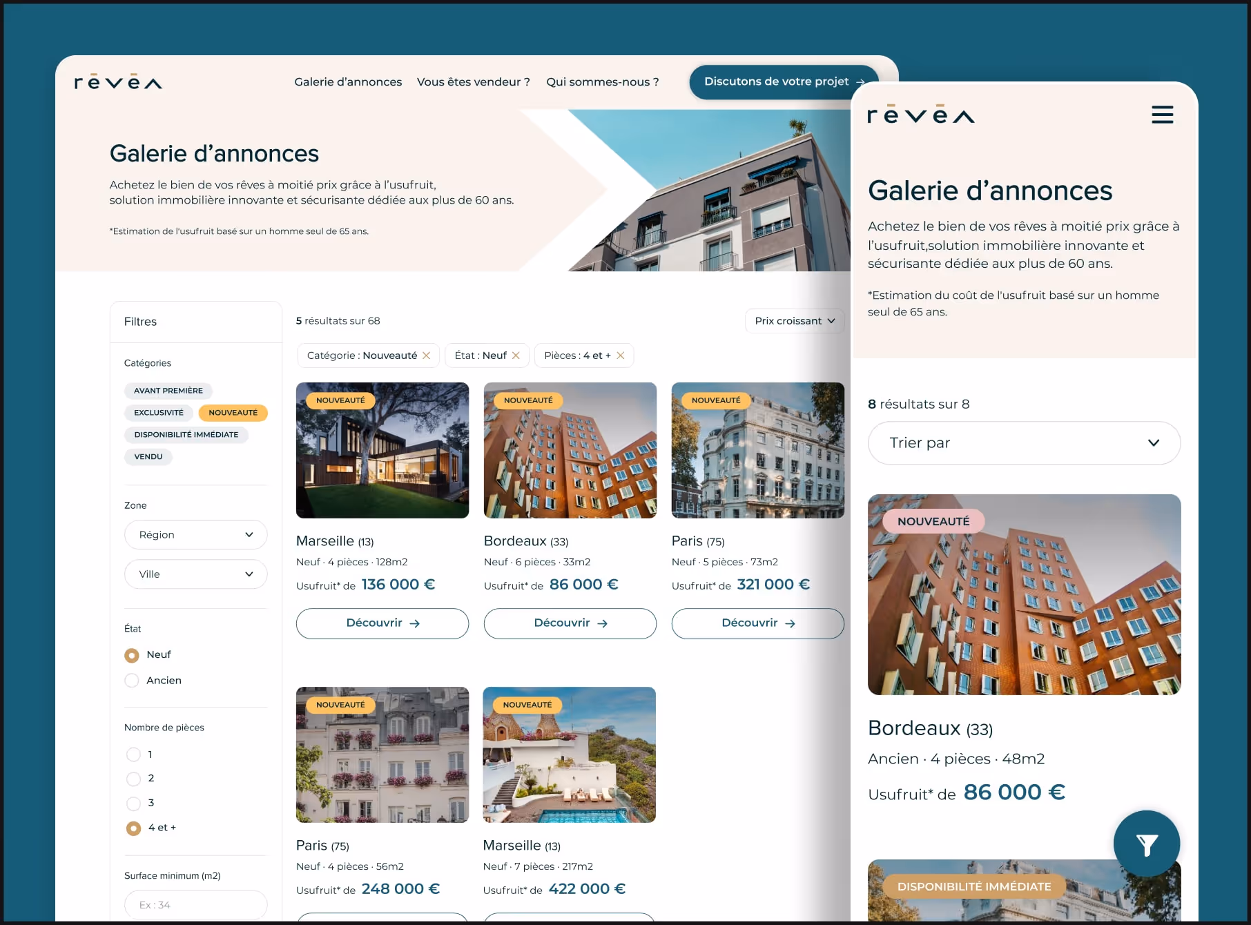 The catalog was designed in close collaboration with the Révéa teams as well as by exchanging with their users to understand their desires and constraints in order to display the most relevant information in order to optimize the conversion rate.