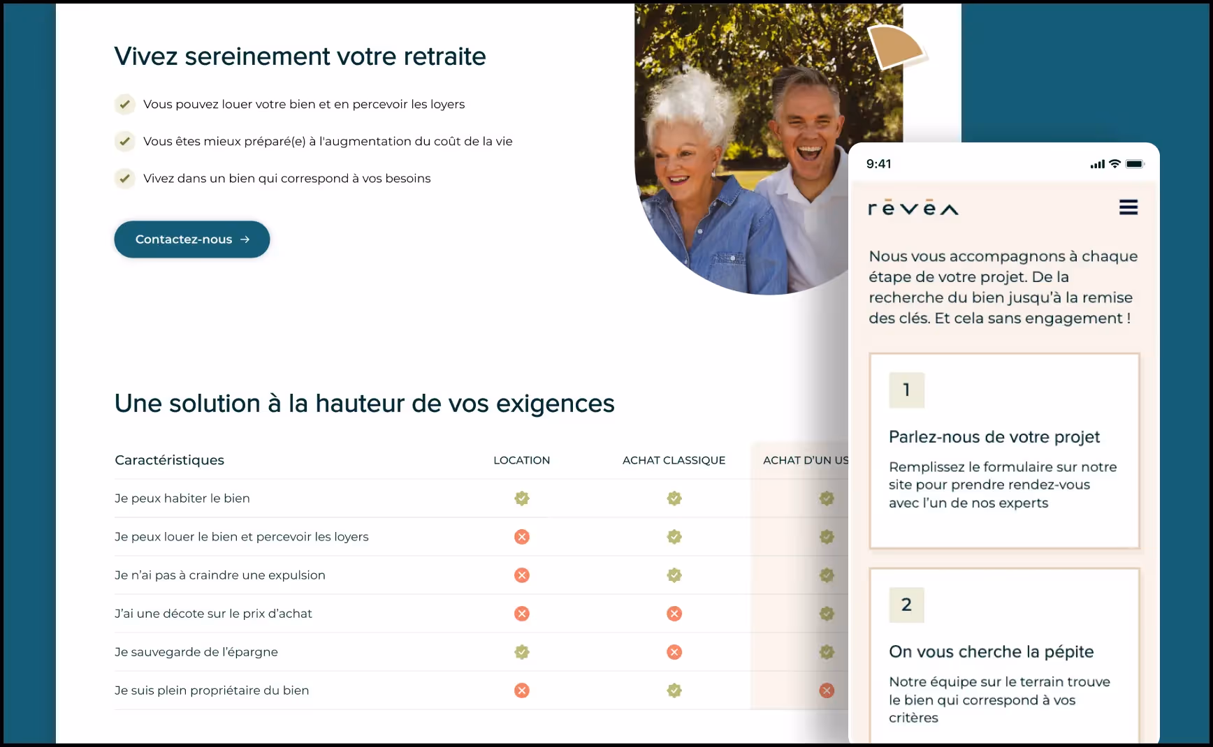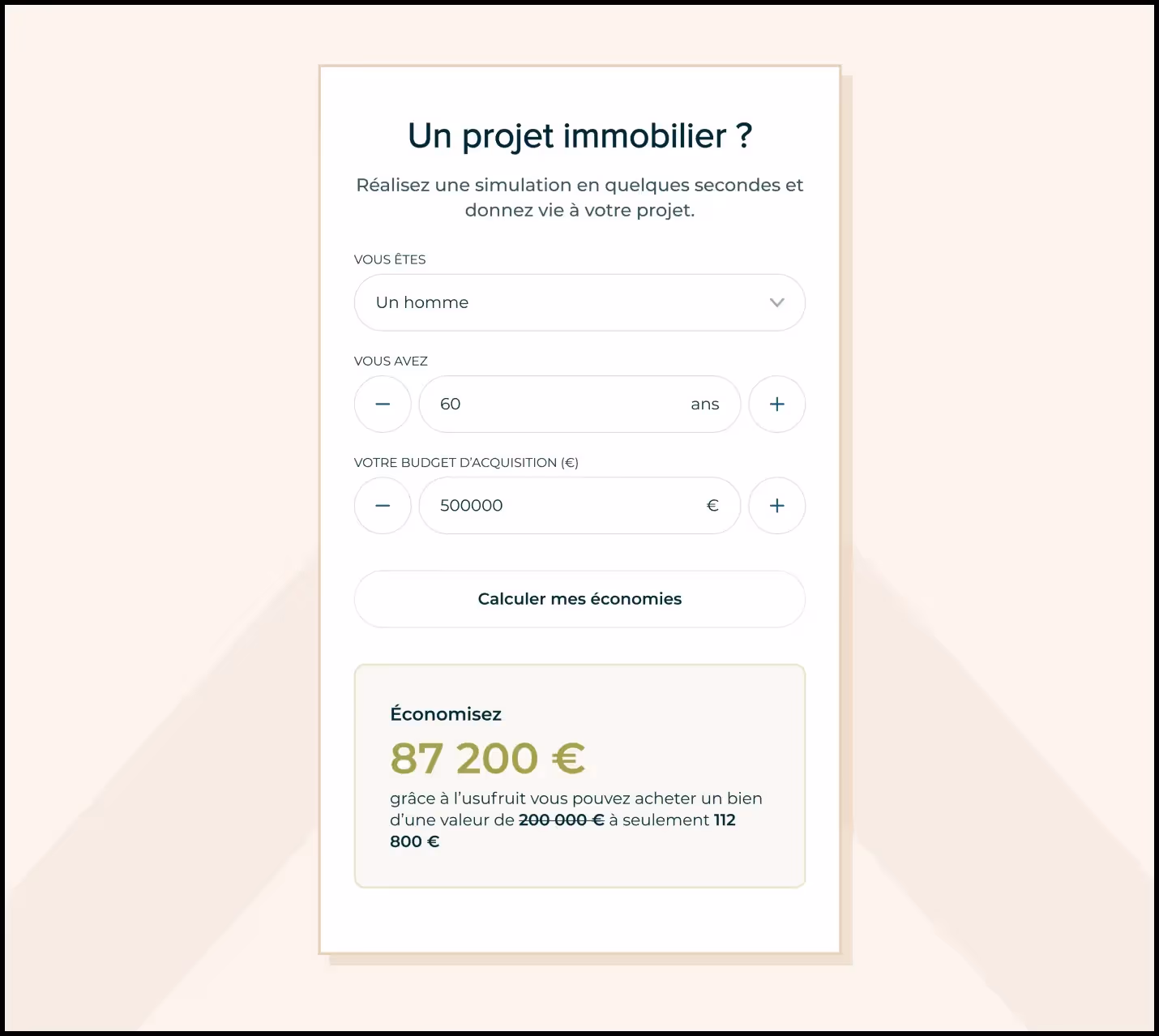 We have provided users with a simulator that calculates the savings made according to gender, age and acquisition budget. The aim of the simulator is to persuade visitors to take action by concretely visualizing the savings that can be achieved thanks to the usufruct concept developed by Révéa.