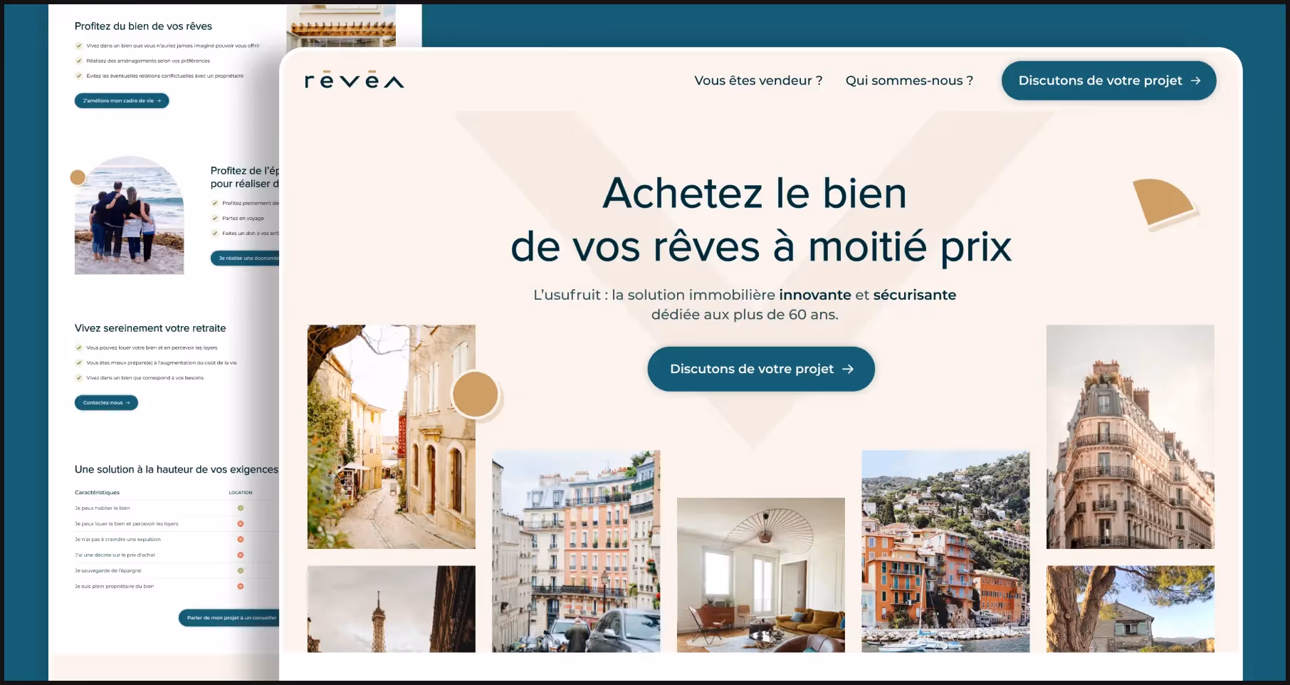 We used images of exceptional properties in the first section of the page to draw users' attention as soon as they arrived on the site. The title (h1) is deliberately catchy to quickly communicate the key message and to attract the curiosity of users.