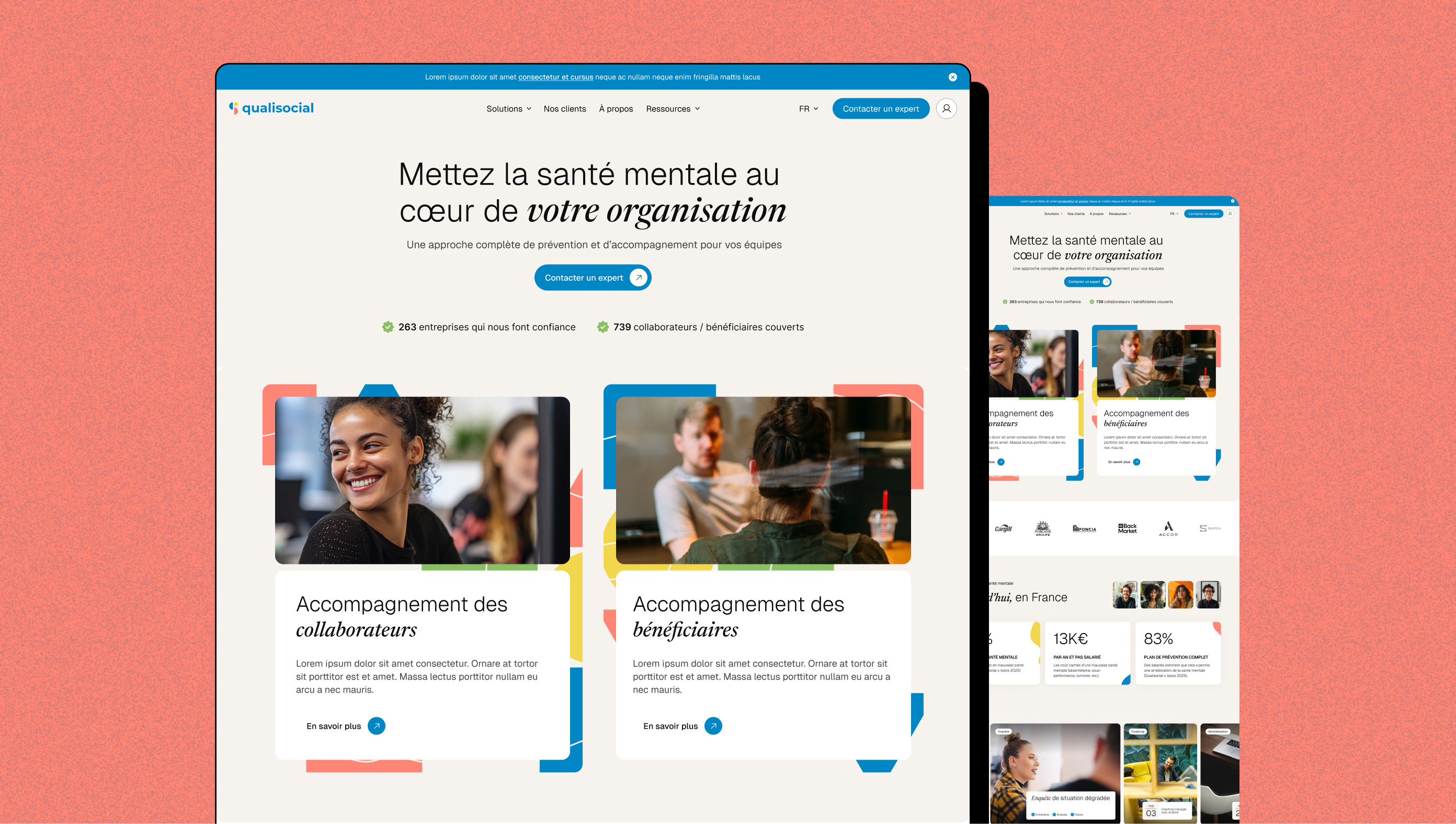 Faced with a international growth, a rich portfolio of solutions (including the mental support platform) Qualicare) and a significant volume of editorial resources, Qualisocial had a strategic need: a website capable of supporting ambitious organic growth while being a conversion lever for complex B2B audiences (HR, managers, institutions).