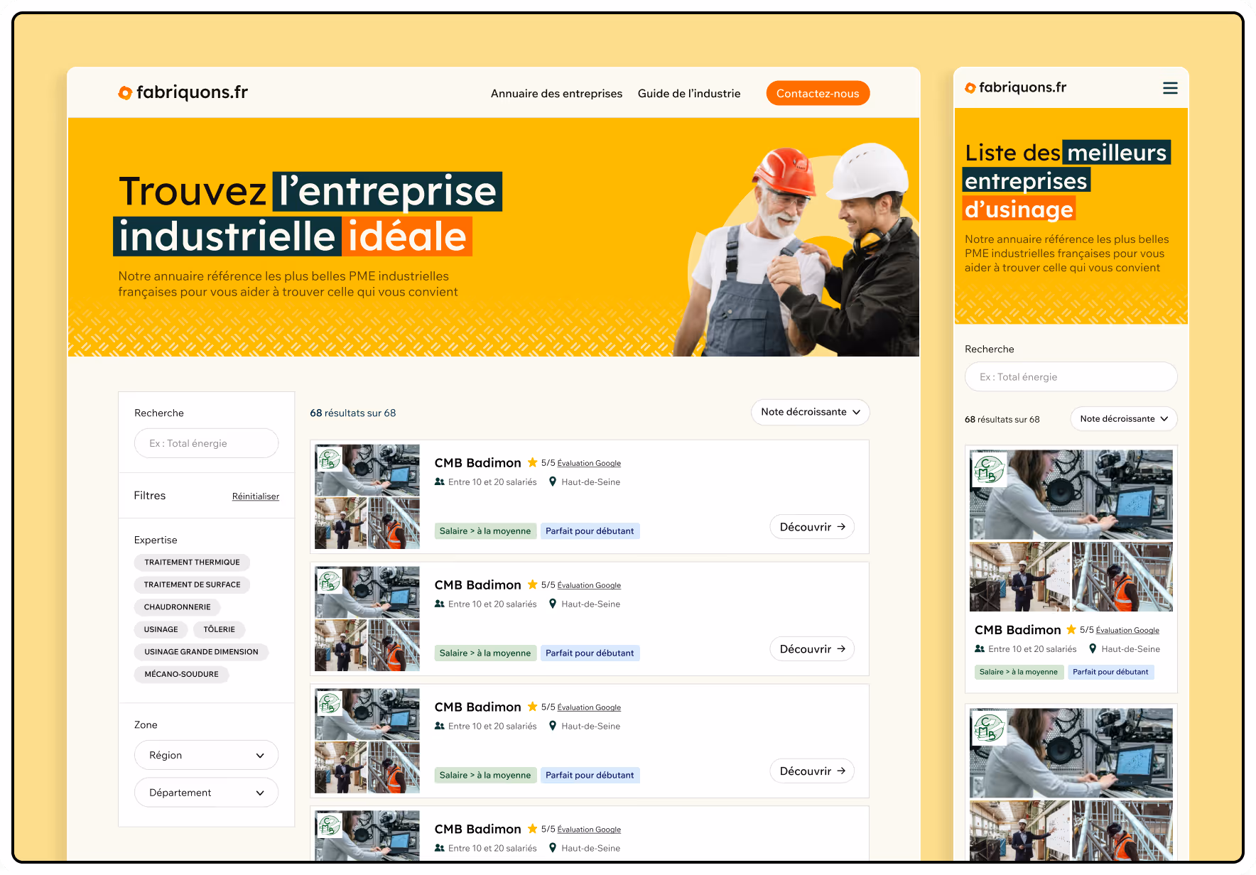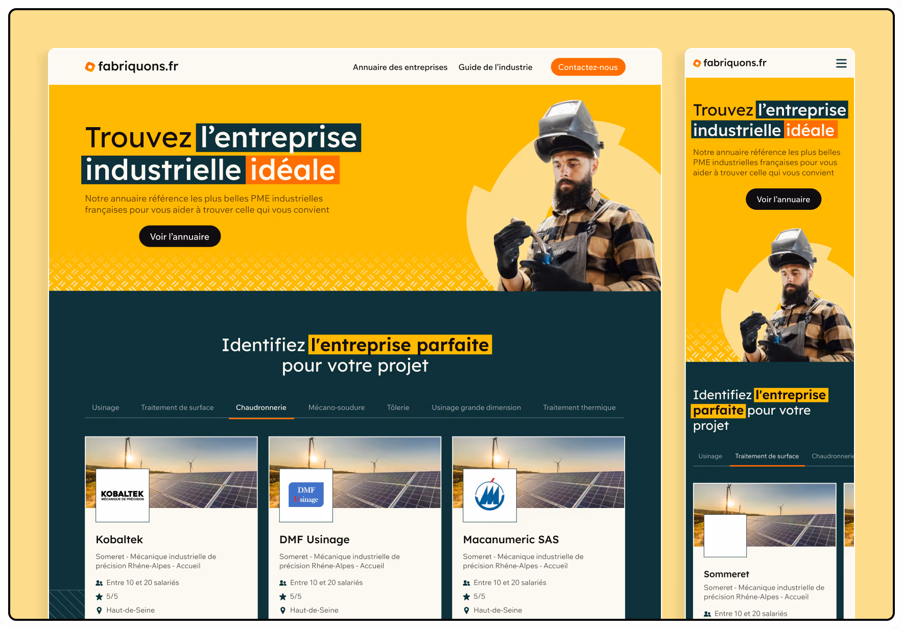 Our design process focused on creating an engaging and intuitive user interface, while respecting the freshly established visual identity to properly value each industrial company and we relied on digital conversion best practices to push visitors into action.